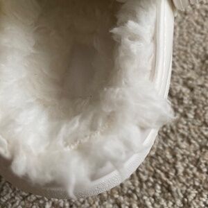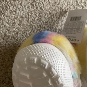 Crocs are pink, yellow, light blue, dark blue, and white. Crocs strap is peeling on right clog as shown in picture 4. Pictures are as shown.