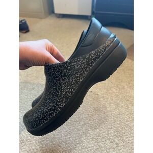 Black with multi gray speckles throughout. Coverage slip on mule size 9 women’s