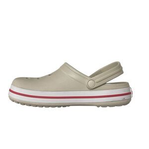 These CROCS water shoes feature a cream and pink color scheme, perfect for aquatic adventures. Designed with ventilation holes for breathability and an adjustable heel strap for a secure fit, they offer the classic comfort and style that CROCS are known for. Ideal for both casual wear and water activities, these shoes are a versatile addition to your footwear collection.