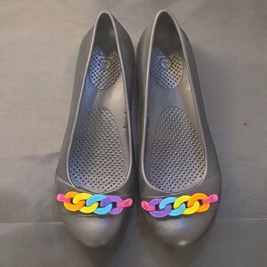 CROCS GIANNA LINK SLIP ON WOMENS FLAT SIZE W8 COLOR BLACK WITH MULTI-COLOR LINK Step out in style with these chic black flats featuring a vibrant chain detail. Perfect for adding a pop of color to any outfit.The dazzling, versatile Gianna ballerinas are perfect for any occasion. The ballerinas are discreet and, with their versatile silhouette and trendy chain appliqué, are suitable for the office and leisure activitiesCrocs, Inc. is a rapidly growing designer, manufacturer and retailer of footwear for men, women and children under the Crocs brand. All Crocs brand shoes feature Crocs' proprietary closed-cell resin, Croslite, which represents a substantial innovation in footwear. The Croslite material enables Crocs to produce soft, comfortable, lightweight, superior-gripping, non-marking and odor-resistant shoes. These unique elements make Crocs ideal for casual wear, as well as for professional and recreational uses such as boating, hiking, hospitality and gardening. The versatile use of the material has enabled Crocs to successfully market its products to a broad range of consumers..THIS ITEMS IS PRE-OWNED EXCELLENT CONDITION WITH ONLY LIGHT SIGNS OF WEAR IF ANY CHECK THE PICTURES