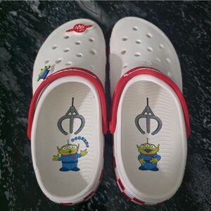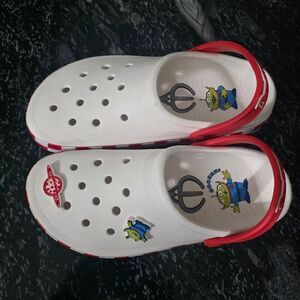 CROCS TOY STORY PIZZA PLANET OFF COURT CLOG MULE SIZE M8 W10 COLOR WHITE &RED Experience the classic comfort of CROCS with these white and red sandals, featuring a signature clog silhouette and ventilation holes for breathability. The foam/rubber material ensures a lightweight feel, while the decorative pins add a playful touch to your footwear collection.Explore the outer limits of taste with the Toy Story Crocs Pizza Planet Off-Court Clog! An homage to Andy's favorite restaurant, this limited edition clog features fully molded Crocs Croslite™ foam construction with allover Pizza Planet branding and Jibbitz™, vented vamp for breathability, convertible heel strap for a secure fit, and lightweight outsole for flexible traction.In 2021, Crocs became a 100% vegan brand, eliminating all animal derived materials from their products. Eliminating materials such as leather and wool reduces environmental impacts across areas such as emissions, waste, and water usage.A world leader in innovative, casual footwear, Crocs, Inc. is dedicated to the future of comfort. Their original and most famous style, the Classic Clogs, are instantly recognized around the world they've sold more than 300 million pairs in over 90 countries! Crocs has achieved their status as a global leader in the casual footwear category by taking an inherently simple approach to uniting style, modern comfort and value.THIS ITEMS IS PRE-OWNED EXCELLENT CONDITION WITH ONLY LIGHT SIGNS OF WEAR IF ANY CHECK THE PICTURES