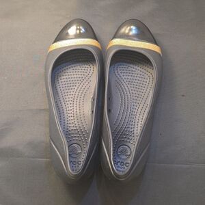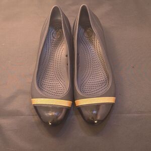 CROCS WOMENS BRYNN BALLET with TOE CAP AND SPARKLE TRIM FLATS SIZE W8 COLOR BLACK with GOLD Trim Step out in style with these chic black flats featuring a vibrant chain detail. Perfect for adding to any outfit.The dazzling, versatile ballerinas are perfect for any occasion. The ballerinas are discreet and, with their versatile silhouette and trendy chain appliqué, are suitable for the office and leisure activities Crocs, Inc. is a rapidly growing designer, manufacturer and retailer of footwear for men, women and children under the Crocs brand. All Crocs brand shoes feature Crocs' proprietary closed-cell resin, Croslite, which represents a substantial innovation in footwear. The Croslite material enables Crocs to produce soft, comfortable, lightweight, superior-gripping, non-marking and odor-resistant shoes. These unique elements make Crocs ideal for casual wear, as well as for professional and recreational uses such as boating, hiking, hospitality and gardening. The versatile use of the material has enabled Crocs to successfully market its products to a broad range of consumers..THIS ITEMS IS PRE-OWNED EXCELLENT CONDITION WITH ONLY LIGHT SIGNS OF WEAR IF ANY CHECK THE PICTURES