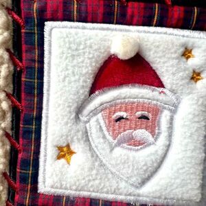 TAN AND BLACK SHERPA WITH OLD FASHIONED STYLE CHRISTMAS SANTA PATCHS AND STITCHING