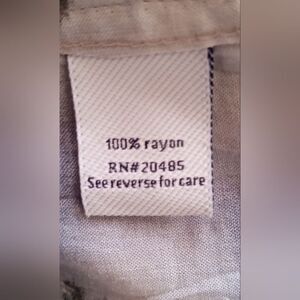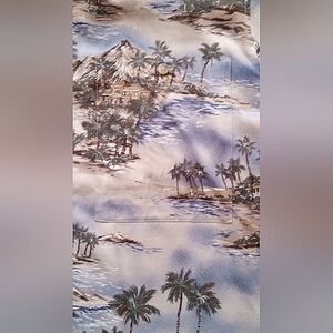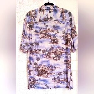 The light blue shirt has a tropical design, the burgundy shirt has a floral design, both are 100% rayon, buttoned down front, side bottom slits, short sleeves, winged collar, front left buttoned pocket, measures 30 inches long, 22 inches armpit to armpit. EUC