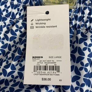 NEW! Cute lightweight elastic waistband with wicking and wrinkle resistant. Mid rise. Drawstring tie in front. Navy and white. Measures 36” waist and length 16 1/2”Excellent condition