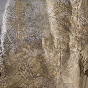 The shirt is designed with a beautiful floral pattern that gives it a vintage look and feel. It also has pockets and is unlined, making it perfect for a beach vacation or outdoor travel. The shirt is machine washable and comes in a multicolor design that is perfect for any tropical or nature-themed event.