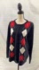 FEATURES/ACCENTS: Crew Neck. Button Down Cardigan Argyle Sweater. Black w/Red & White Argyle Pattern on Front Only.