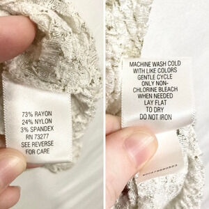 Croft & Barrow brand. Size small. White and faded green floral patterned short sleeve crew neck top. Should perhaps be worn with an undershirt as the flowers all have cutout detailing. In preloved condition, no visible flaws (see photos for condition); as with any preowned clothes, you should wash before wearing the first time. Made of 73% rayon, 24% nylon, 3% spandex.