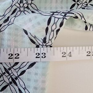 So pretty spring blouse! Croft & Barrow scoopneck blouse with front buttons. 100% polyester lightweight trellis print in pale mint green/pink and navy blue. Measured flat 23.5" underarm seam to seam. Elastric wrist sleeve measures 21.5". 25" length. Size Large EUC