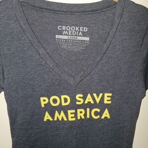 Blue with yellow lettering Crooked Media "Friend of the Pod" v-neck t-shirt. In good pre-owned condition. It is marked size large, but based on their size chart and my approximate measurements I believe it fits more like a size small so it is labeled accordingly.