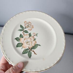Introducing a lovely CROOKSVILLE CHINA CO. GLENDALE Plate Salad that will add a touch of elegance to your dining table. This vintage plate is round in shape and has a glossy finish. It is made of fine china and features a beautiful white color that will complement any meal you serve on it.