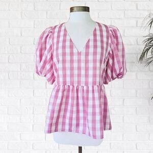 CROSBY Mollie Burch Jackie Puff Sleeve V-neck Top Medium Pink White Gingham