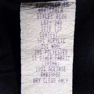 THIS HANDSOME BLACK AND RED PLAID BLAZER BY CROSS COUNTRY FASHIONS, SIZE 12P, is gently pre-owned, in excellent or better condition. The fabric and care label is very crinkled and faded (but still legible; picture #14), but it's otherwise free of defects or damage, with little to no sign of wear. It has padded shoulders, a collar and lapels, pouch pockets in the lower front, and a 1-button closure in front. It's fully lined in lustrous black 100% acetate fabric. The outer fabric is a blend of 50% acrylic, 25% wool, 20% polyester, and 5% other fabric, dry clean only recommended. The stated size is 12P, but prospective buyers are encouraged to compare the measurements with those of a jacket that they know fits well prior to purchase. Measurements are: chest, pit to pit 21"; no waist measurement, it flares slightly to the hemline, which measures 23"; shoulder 17.75"; sleeve 22.5"; length (in back, collar seam to hem) 28.5".