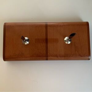 This vintage CROSS double pen and/or mechanical pencil holder is made of walnut wood and has a mid-century modern design. It is a rare and hard-to-find item, perfect for displaying on a desk. Made in the United States, this desk accessory adds a touch of elegance and functionality to any workspace.