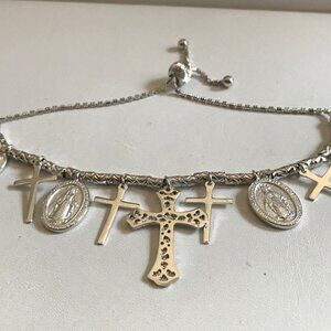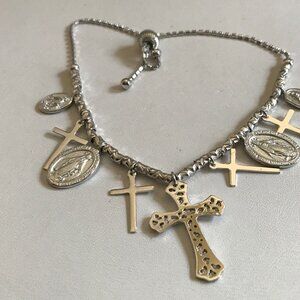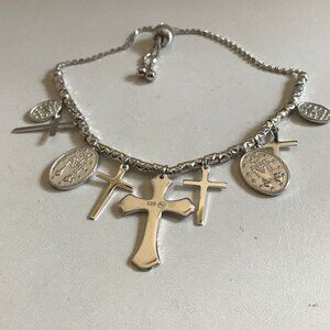 CROSS & MEDALLION CHARM LARIAT BRACELET / 925 STERLING SILVER / 9'' ADJUSTABLE