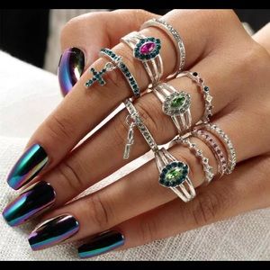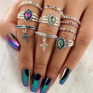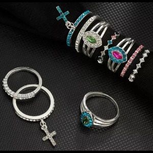 10-PIECE CROSS RING SET/ JEWEL-TONE COLOR STONES/ SILVER ALLOY METAL/ WEAR ON ANY FINGER ABOVE OR BELOW THE KNUCKLE, ASSORTED SIZES, FUN PARTY CHIC HIPPIE GYPSY TURKISH BOHEMIAN STYLE FASHION JEWELRY/ BUNDLE ITEMS IN MY SHOP AND SAVE ON SHIPPING CHARGES! NEW