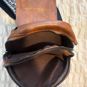 Fake leather brown bag, with pockets, and zippers, with a trendy strap that is removable.