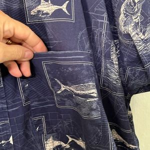 Preowned mens Hawaiian big fish blue & white print 100% cotton shirt.