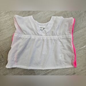 This Crown & Ivy baby top is a sleeveless, lightweight piece perfect for warmer weather. It features a soft, white fabric with a ruffled neckline and a drawstring detail at the waist for a comfortable and adjustable fit. The top has a bright pink trim along the neckline and armholes, adding a playful pop of color.