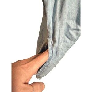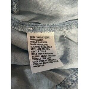 This is a Crown & Ivy blue jean dress in size Large. It features embroidered detailing on the sleeveless design, giving it a boho casual style. The dress has a round neckline with button closure, made of denim fabric. It is a shift/sheath style dress with pleated accents, lightweight and soft, suitable for various occasions such as travel, weddings, parties, workwear, and more. Perfect for all seasons and offers comfort with a tropical vacation vibe.
