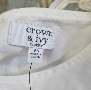 This stylish white blouse by Crown & Ivy showcases a delightful peplum hem and ruffled accents, offering a touch of elegance and charm.
