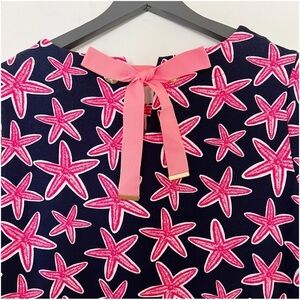 Crown and Ivy navy and pink starfish print knit shift dress. Round neckline. Ties at beck of neck with grosgrain ribbon. 3/4 length sleeves. Pullover styling. Cotton, spandex. Machine wash cold.