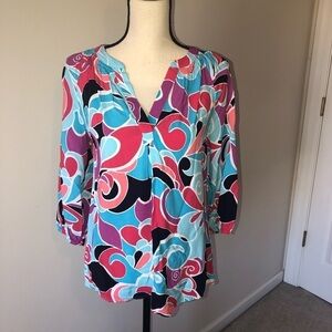 Multi color print top with vneck. Loose fit with 3/4 length sleeves. Has elastic at the sleeves. Measurements: armpit to armpit 17”, length 24”, sleeves 19”. Excellent condition