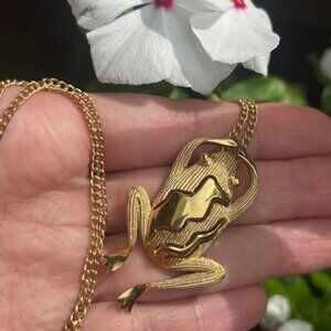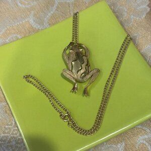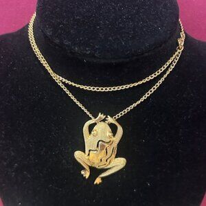 • Vintage MCM 1950s-60s Crown Trifari © Hallmarked 3-D Gold Tone Textured Frog Pendant Necklace