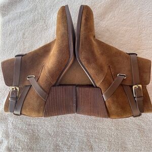 Crown Vintage Suede Leather ankle booties with cross strap buckle. Side zipper.