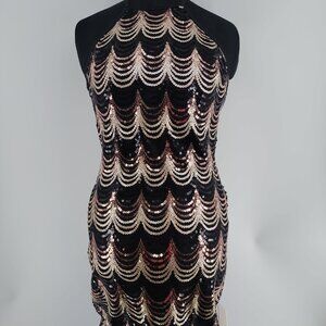 Step into full glam with this Crystal Doll gold + rose gold sequin halter gown, serving instant red carpet energy. The shimmering scalloped pattern catches every light in the room, while the fitted halter silhouette and open keyhole back bring the drama.