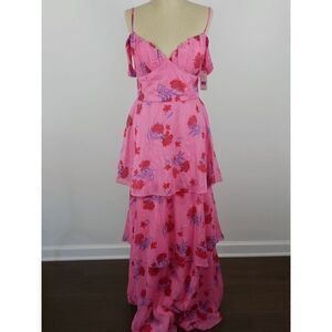 Pleated bodice; cold-shoulder pleated draped detailing ties at deep V-back; triple-tiered skirt