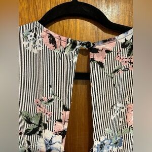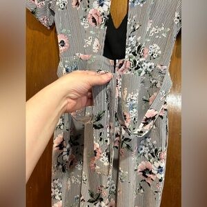 Crystal Sky Women’s Black White Striped Tie Front Wide Leg Cropped Jumpsuit Size: juniors size 3 Brand: Crystal Sky - black / white in color - striped and floral pattern - short sleeves - tie front - wide leg fit - cropped style