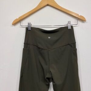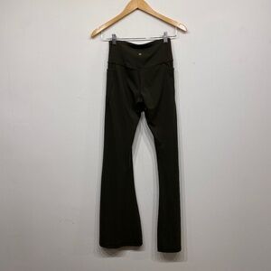 Dark green yoga pants. Has a cross waist style, flare legs and stretchy tight material. In excellent condition. The size tag is missing but they fit like a small.