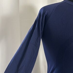 this is like a dark royal blue. it is stretchy. it is an athletic material. it is long sleeves. size small. in good used condition