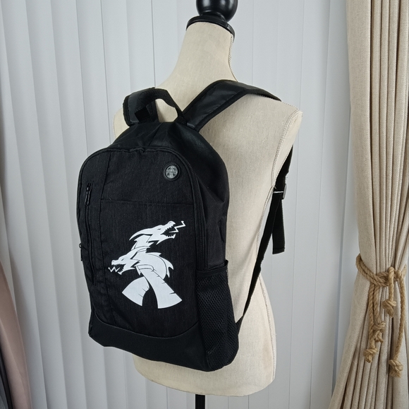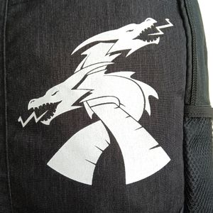 Light washable material. Black with Dragon design. Side water bottle pocket. Adjustable shoulder straps. New without tags.
