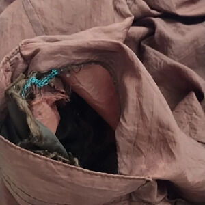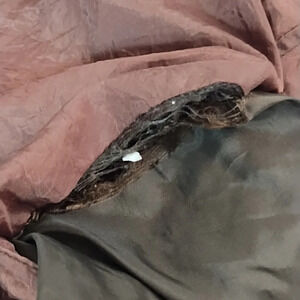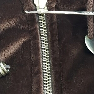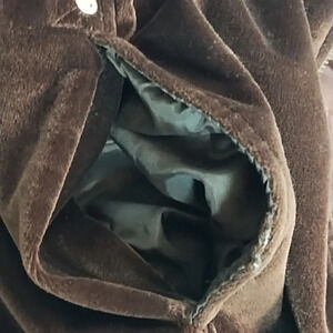 Pre-owned in good condition with signs of wear. inside pockets have holes. Velvet/velour side pockets do not. The zipper pull is missing a piece but does have a hole so a string or something could be added. The sleeve cuffs are loose. It's still a really cute jacket so I couldn't pass it up.