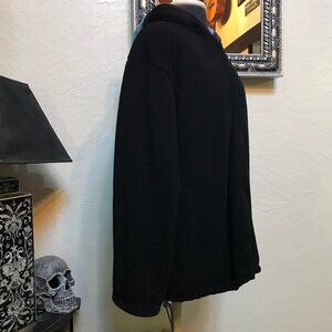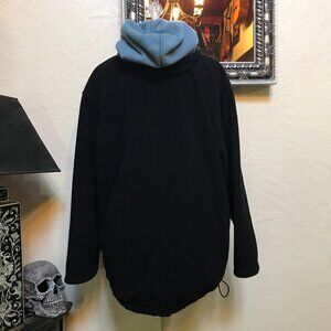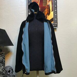 Selling a used CS Signature Hooded Zip Up Sweater in good condition no rips or stains Sweater has 2 outer pockets and is made of 100% Polyester & the seam binding is 100% Nylon color is Black on the outside and light blue inside size is large.