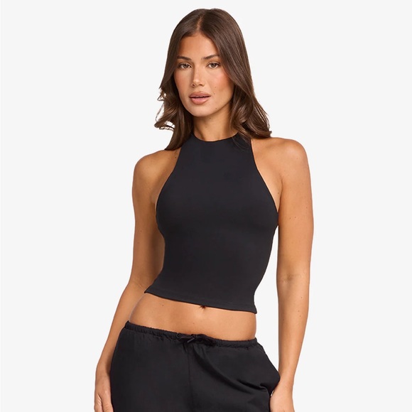 Sleek and stylish black halter neck top for women. Perfect for any occasion.