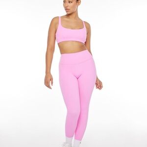 crush pink, high-waisted leggings, light compression, non-padded sports bra, vibrant activewear, trendy sports set, fitness outfit, lounge wear, colorful gym wear, statement active set