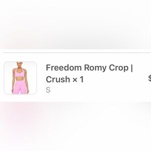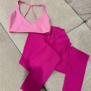 Stylish pink sports bra with matching leggings. Perfect for workouts. Too is freedom romy crop small. Like new. Worn less than 5 times. Beautiful v-cut and strappy back. Bottoms are hop pink serenity material, no scrunch bum. Size small. Last picture shows what it looks like on.