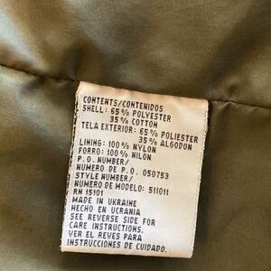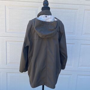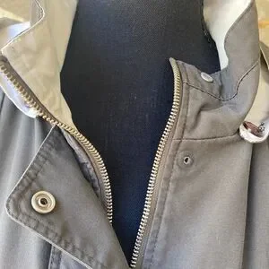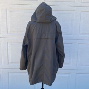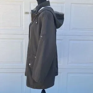 Lightweight army green trench jacket with detachable hood that’s perfect for spring or fall weather. The jacket has both zipper and snap closure with patch pockets. The snap at the top of the jacket is broken. Please see all pictures