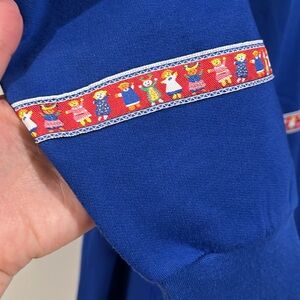 C.S.T. Sport pullover/tunic, see length, in vibrant blue with red accents. Features a half-zip design and front pocket. The embroidered ribbon features little children from around the world (all shapes, colors, sizes).