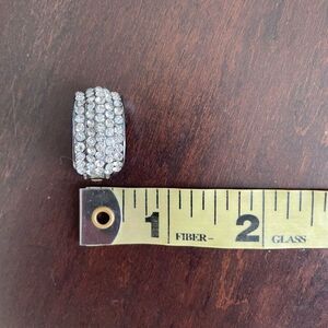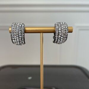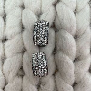 C shaped rhinestone crystal clip on earrings that measure approximately an inch long and a half inch wide. Several rows of rhinestone crystals and gunmetal tone base. I have pierced ears but sometimes with larger earrings for special occasions I prefer the clip on so they don’t drag on my pierced ear too much. These are lovely and sparkly. Used once.