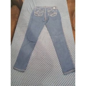 The solid pattern jeans have a rise of 10 inches, and the inseam measures 28 inches. The jeans have accents of button and zipper, and the fabric type is denim. These jeans are brand new with tags, fitting regular size types, and the color is a beautiful blue shade. This pair of jeans is perfect for any occasion, as it is versatile and stylish.
