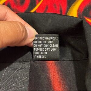 Bold and fiery C-Two button up shirt featuring a striking red and black flame and tribal design for that true Y2K or retro bowling shirt vibe. Made with soft, lightweight fabric and a relaxed fit for comfort and style. Excellent condition with no flaws. Approximate measurements: pit to pit 24.5”, length 31”. Perfect statement piece for casual wear, parties, or collectors of vintage streetwear.