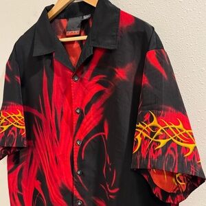 C-Two Men’s XL Black Red Tribal Flame Fire Print Button Down Shirt Y2K Bowling