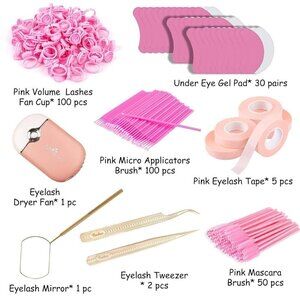 Cuckoo Eyelash Extension Supplies, Professional Lash Extension Kit for Eyelash Graft, Include Mini Fan Lash Dryer, 2 pcs Straight and Curved Tweezers, Large Lash Mirror, Pink, 289 Piece Set