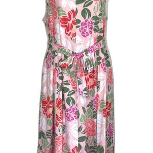 This semi-fitted comfortable and easy-to-wear pink floral maxi dress is uniquely paneled, printed design in a peach jersey knit featuring matching tie belt, scoop neckline, seam pockets, and pullover styling. Versatile dress to take on vacation, or for a day at the shore, or a bathing suit cover-up, or a day at home in your backyard.