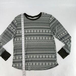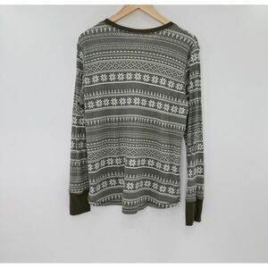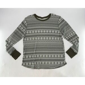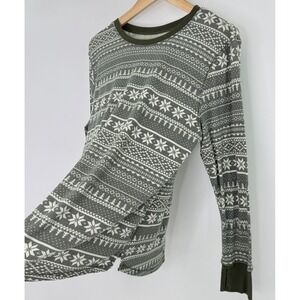 A cozy and stylish Cuddl Duds stretch thermal long sleeve top in size XL. This top features a classic fair isle pattern with charming snowflakes and winter motifs in a sophisticated grey and white palette, accented with solid olive green cuffs and neckline. The thermal knit fabric offers warmth and comfort, perfect for layering. Ideal for lounging at home on a chilly evening, wearing for a festive holiday gathering,