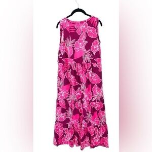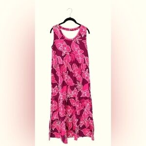 Cuddl Duds soft, pink and purple abstract floral maxi dress with a ruffle hem 1X side pocket